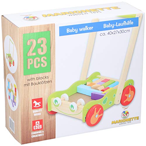 Je kleintje kan achter deze kleurrijke loopwagen met houten blokken van Marionette Wooden Toys lopen. Met de houten blokken in de houten wagen kun je alle soorten constructies maken. Een huis, een kasteel of een toren, zo hoog mogelijk. Ondersteuning bij het lopen. Naast speelgoed kan deze loopwagen ook een hulpmiddel zijn voor het leren lopen. Houd er rekening mee dat je kleintje de basis van het lopen al onder de knie heeft. Het vasthouden aan het stuur van de wandelaanhanger geeft je kind iets meer grip en zorgt ervoor dat het niet zo snel omvalt. De blokken in de wagen zorgen voor iets meer gewicht, zodat de wagen stabieler blijft. Blijf echter altijd bij hem als je met de blokwagen rondloopt. Gemaakt van hoogwaardig hout. Deze houten loopwagen ziet er met zijn vrolijke kleuren en vriendelijke blokogen zeer aantrekkelijk uit. Je kind zal er graag mee spelen. Het is gemaakt van kwaliteitshout. Houten speelgoed is robuust, sterk en dus duurzaam. Het kan een klederdrachttest verdragen en duurt daarom langer mee. Hout is ook een natuurproduct en voelt smaakvoller en warmer aan dan kunststof of plastic. Dit speelgoed is CE-getest en geschikt voor kleinere kinderen.